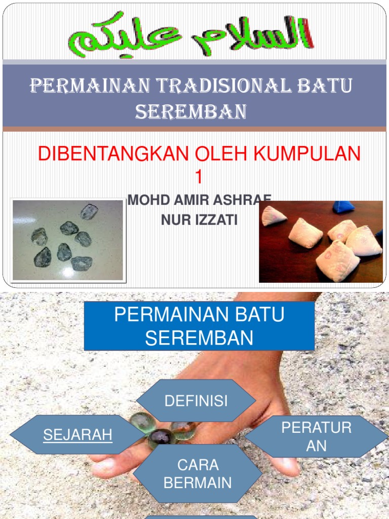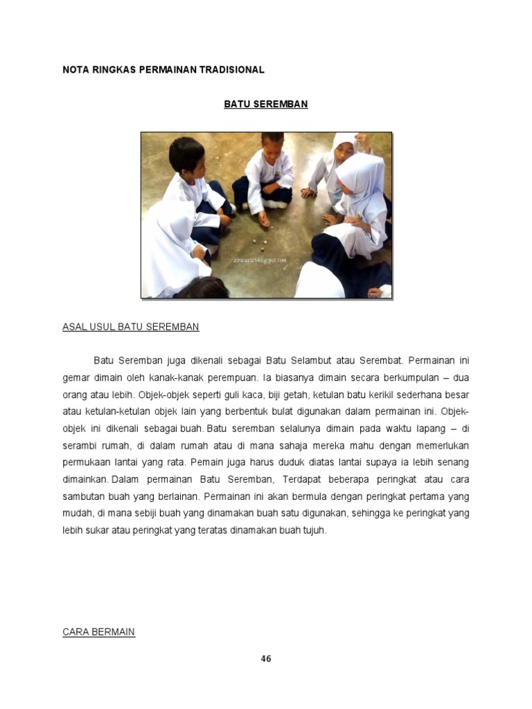 5 Pendidik memperkenalkan batu seremban kepada kanak-kanak iaitu sejenis permainan tradisional. CARA-CARA BERMAIN BATU SEREMBAN. Untuk BATU SATU pilih satu daripada lima biji batu seremban untuk dijadikan balingan.