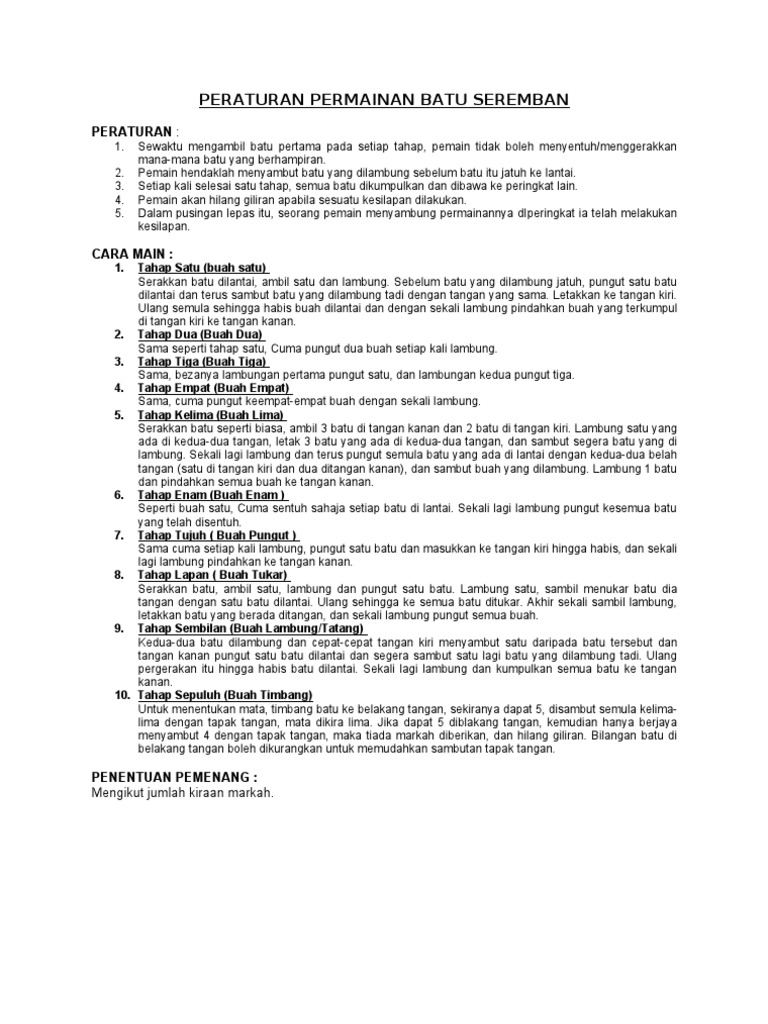 . Seterusnya ulang langkah yang sama sebanyak empat kali dengan. Peraturan Bermain Batu Seremban. Permainan ini akan bermula dengan peringkat pertama yang mudah di mana sebiji buah yang dinamakan buah satu digunakan sehingga ke peringkat yang lebih sukar atau peringkat yang teratas dinamakan buah tujuh.