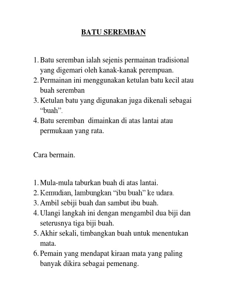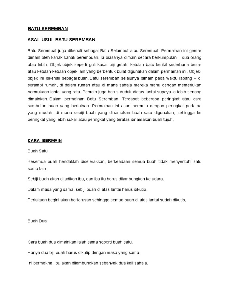 Get started for FREE Continue. Dalam permainan Batu Seremban Terdapat beberapa peringkat atau cara sambutan buah yang berlainan. Terbalikkan kain dan isikan dengan manik beras kacang atau kacang hijau.